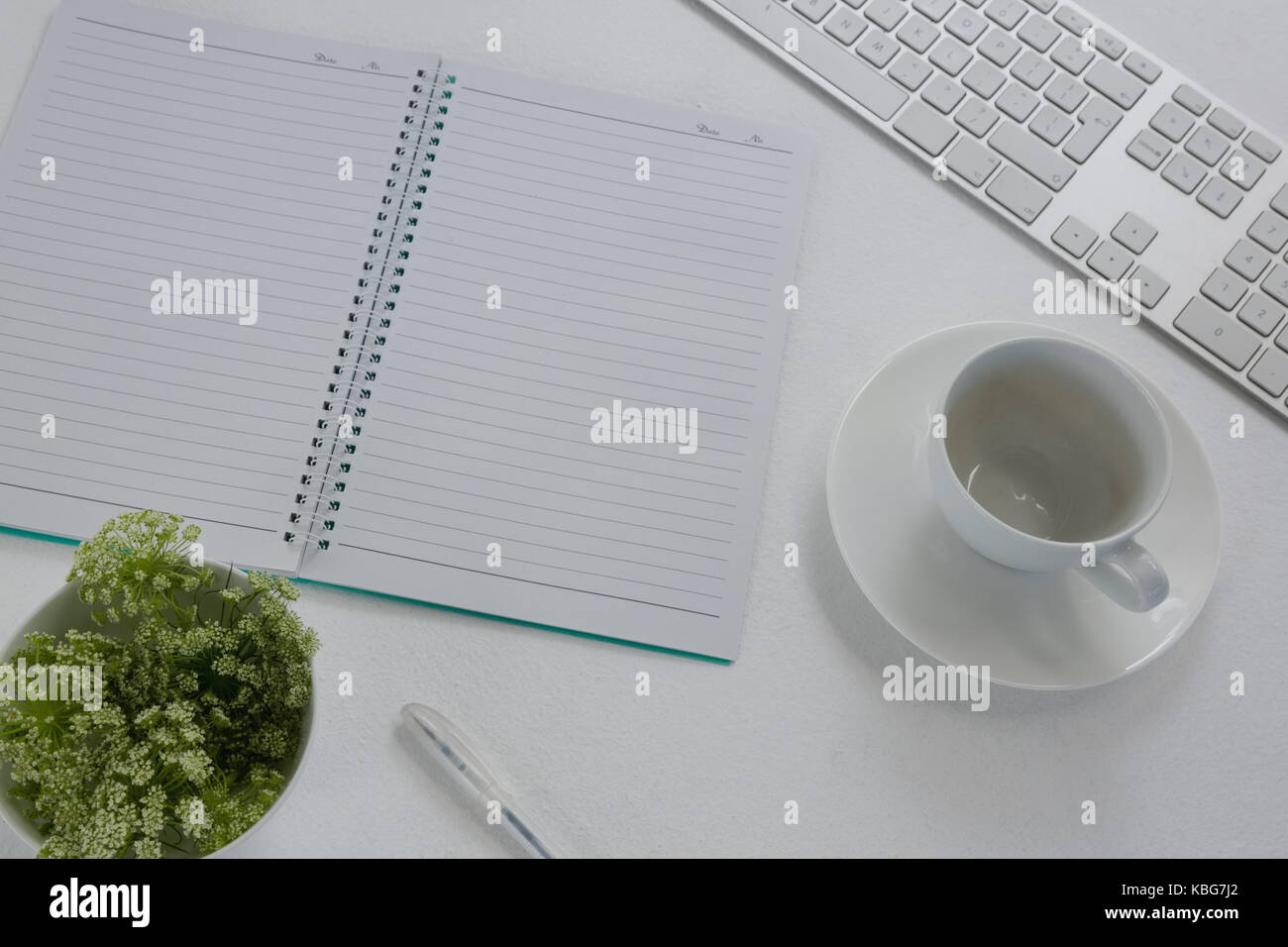 Overhead Of Keyboard Pot Plant Pen Book Coffee Cup And